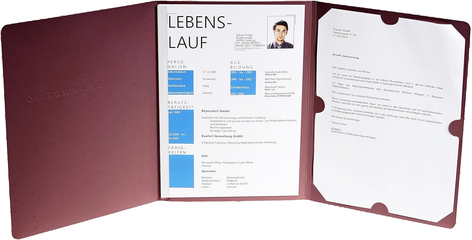 Stellen Sie sich vor: Ihre Bewerbung liegt auf dem Schreibtisch des Personalers. Während andere Mappen langweilig und austauschbar wirken, sticht Ihre durch die edle Bordeaux-Farbe und die hochwertige Haptik hervor.