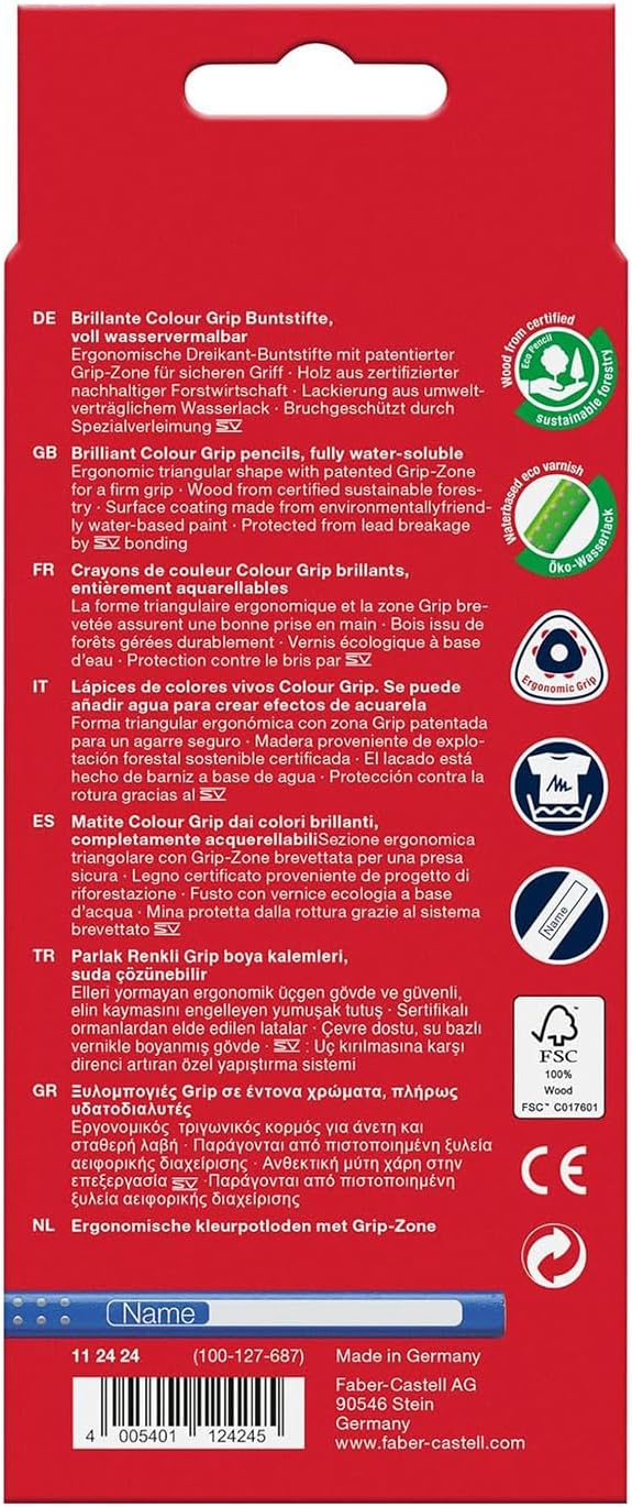 Die Colour Grip Buntstifte von Faber-Castell im 24er-Etui vereinen leuchtende Farben mit ergonomischem Komfort. Mit patentierter Soft-Grip-Zone, wasserlöslichen Pigmenten für Aquarelleffekte und bruchsicherer Mine sind sie die idealen Begleiter für kreatives Malen und Zeichnen.