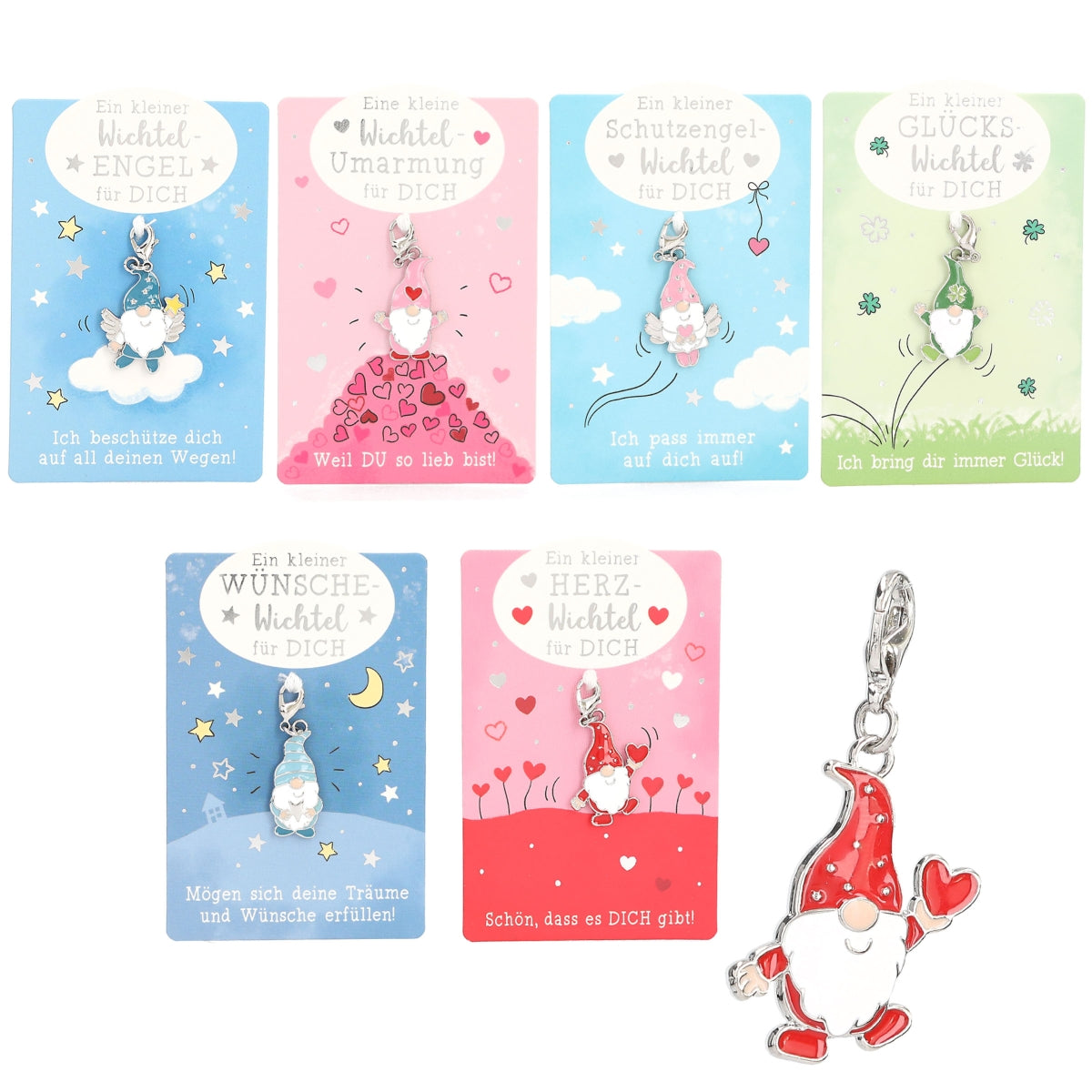 Diese wonnigen kleinen Wichtel bringen Freude in den Alltag! Jeder Anhänger ist auf einer liebevoll gestalteten Karte mit süßer Botschaft befestigt – ob Liebe, Glück, Wünsche oder Schutz. Mit dem silbernen Minikarabiner lassen sich die Wichtel ganz einfach an Schlüsselbund, Tasche oder Rucksack befestigen. Ein herziges Mitbringsel, das garantiert ein Lächeln zaubert!