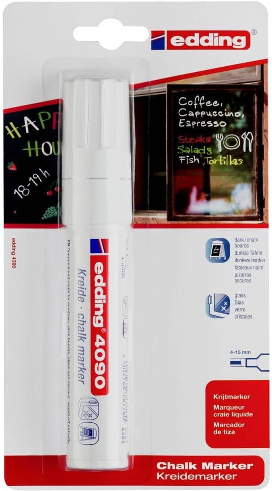 Der edding Kreidemarker 4090 in Weiß ist Ihr zuverlässiger Partner für alle Beschriftungen auf dunklen Oberflächen. Mit seiner 4-15mm Strichbreite eignet er sich perfekt für: