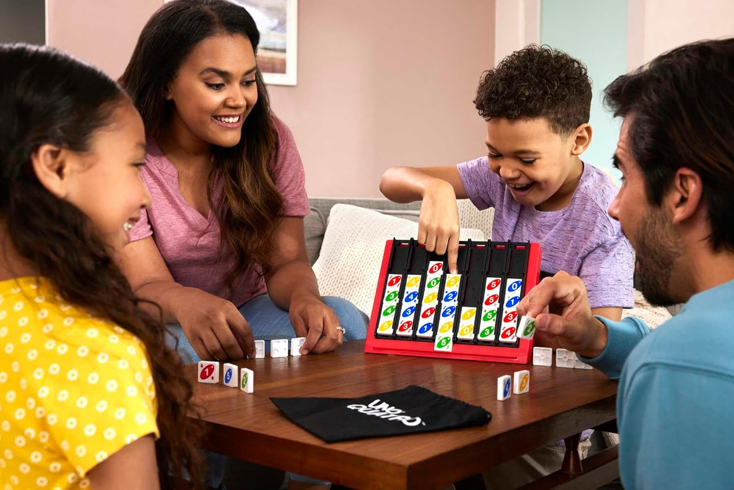 UNO Quatro vereint den Klassiker "Vier gewinnt" mit der beliebten UNO-Mechanik. Sortiere deine Spielsteine nach Farben oder Zahlen und erreiche als Erster vier in einer Reihe – diagonal, senkrecht oder waagerecht.