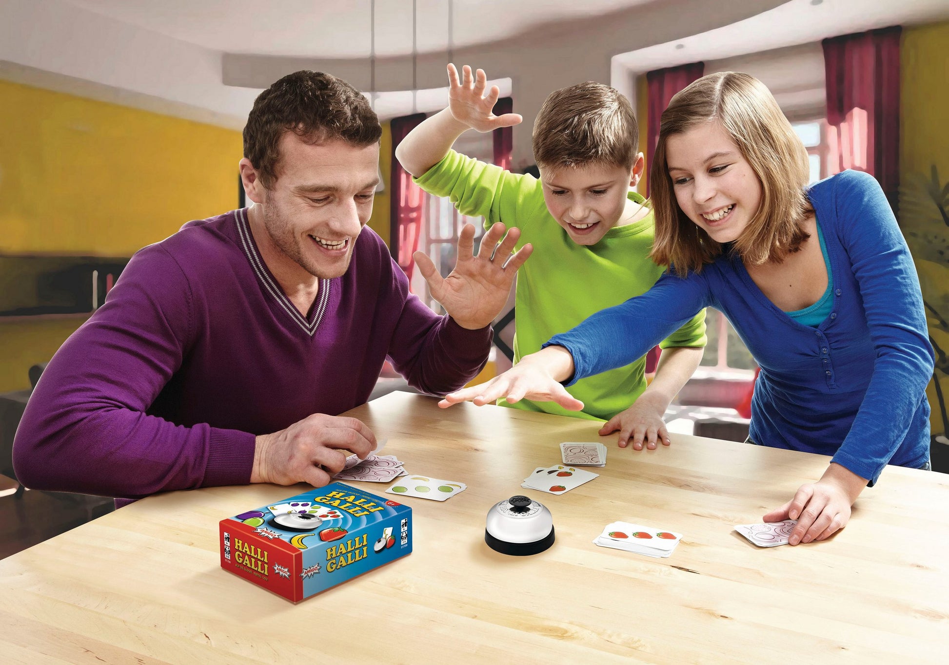 Auf die Glocke – fertig – los! Halli Galli ist das actionreiche Familienspiel, das seit über 30 Jahren Familien und Freunde begeistert. Sobald genau fünf gleiche Früchte auf den aufgedeckten Karten zu sehen sind, heißt es: so schnell wie möglich auf die Glocke hauen! Wer am schnellsten reagiert, gewinnt die Karten – wer am Ende die meisten hat, gewinnt das Spiel.