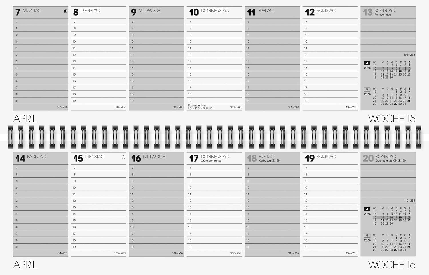 Dieser elegante Wochenkalender im praktischen Querformat bringt Struktur in Ihren Alltag. Mit der bewährten Wire-O-Bindung liegt er flach auf dem Schreibtisch und bietet Ihnen optimalen Komfort beim Planen.
