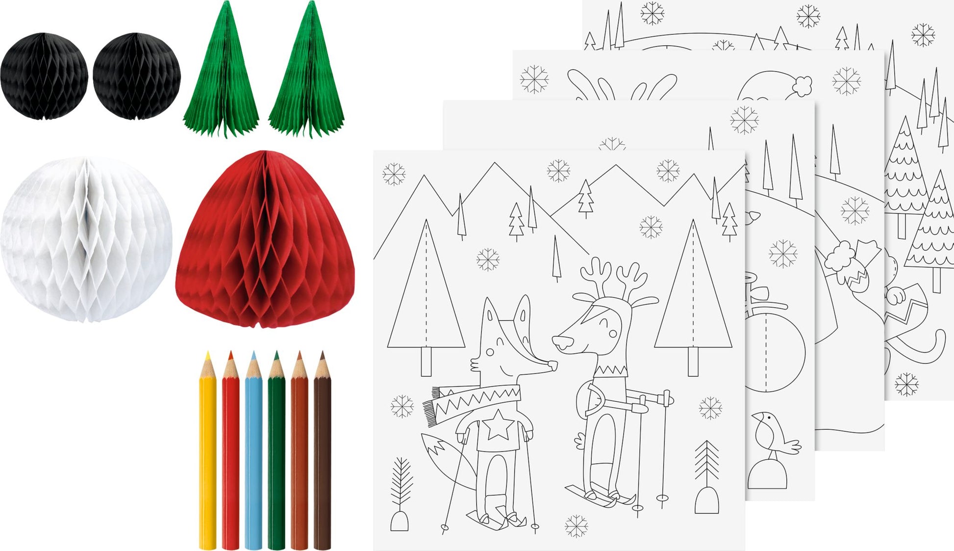 Inhalt: 4 Ausmalbilder, 6 Buntstifte, 3D-Wabenpapier-Sticker, Wackelaugen