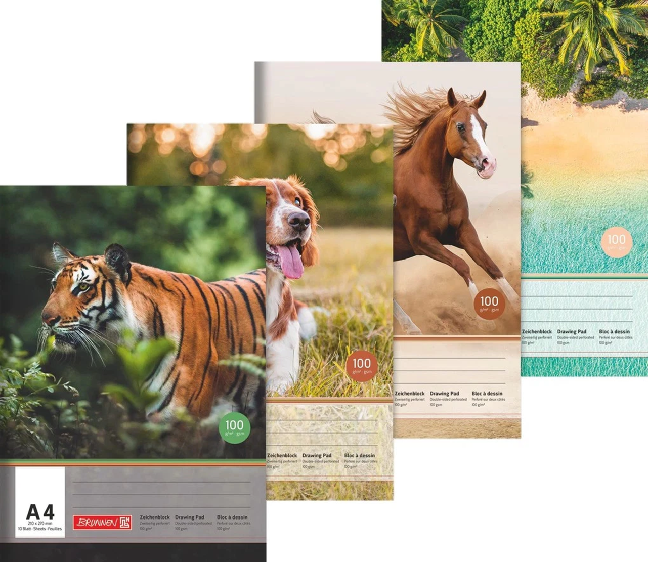 BRUNNEN Zeichenblock A4 mit Tiermotiven - Premium Zeichenpapier 100g/m²